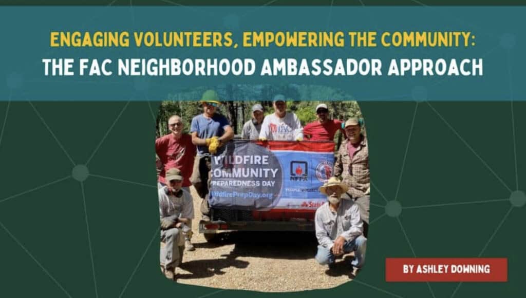 Engaging Volunteers, Empowering the Community: The FAC Neighborhood Ambassador Approach — Highlights a sustained volunteer outreach framework for wildfire readiness and mitigation, with practical tools and examples for launching neighborhood ambassador programs.